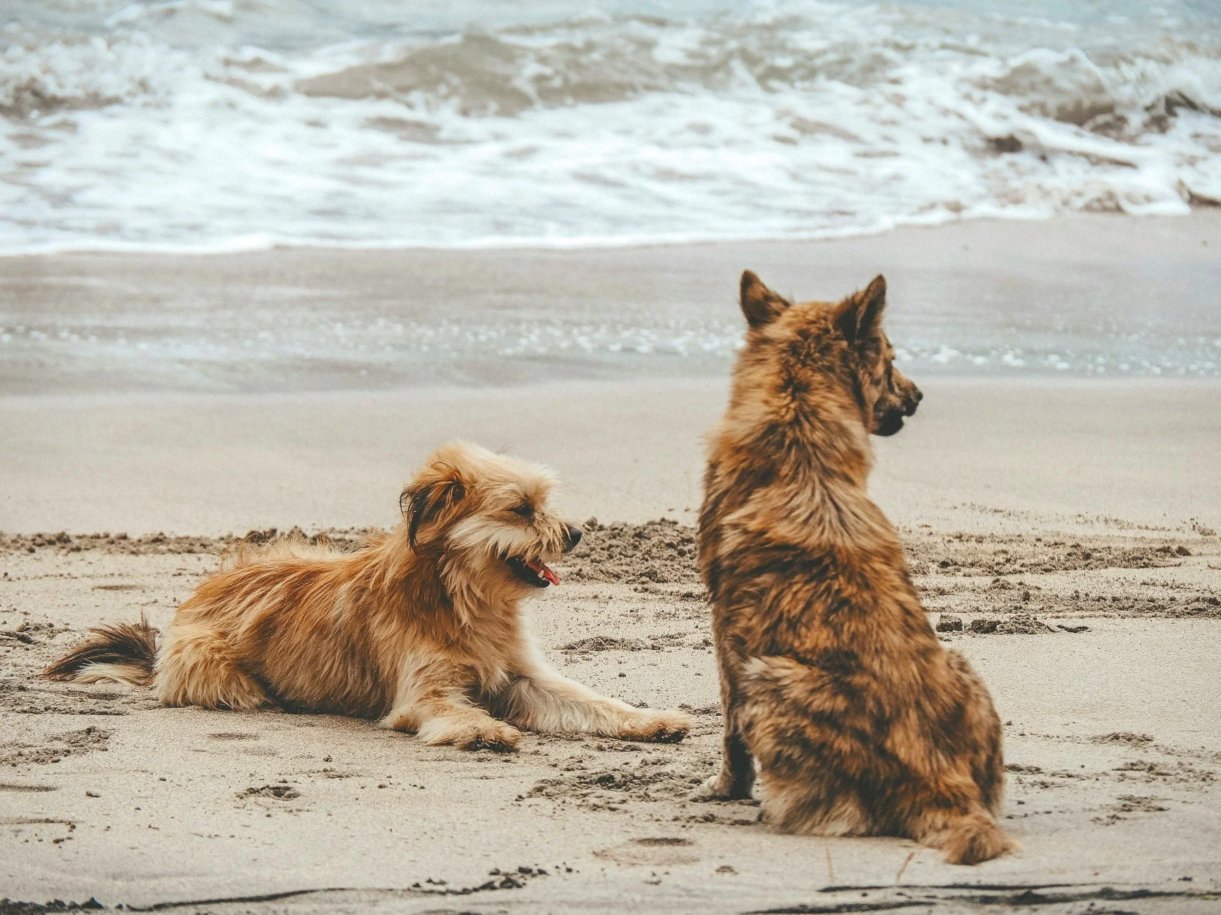 Two dogs on a sandy beach with ocean waves in the background. One dog is lying down, and the other is sitting and facing away from the camera.